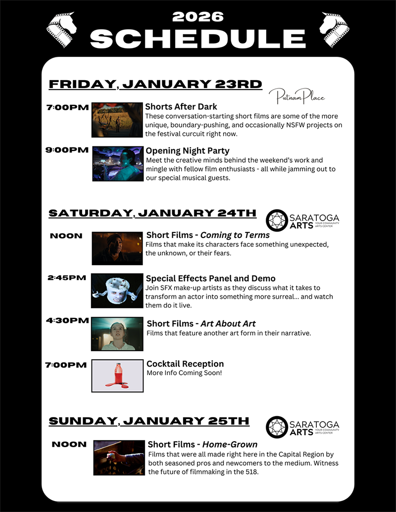 The Saratoga Film Showcase is a weekend-long exhibition of the newest generation of filmmakers, and a celebration of their work in our region and beyond. Hosted at Putnam Place and Saratoga Arts, and sponsored by Discover Saratoga, SFS will offer audiences a comprehensive glimpse into independently-produced cinema, as well as an opportunity to connect with the artists. This year’s weekend-long showcase will feature a panel of special effects artists who will reveal how they create the impossible, culminating in a live demonstration by Cherry Valley-based SFX make-up artist RJ Young. The short film offerings have nearly doubled this year, spanning drama, horror, experimental, comedy, and more.